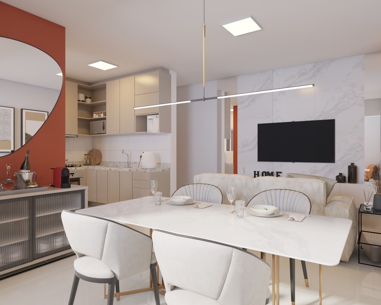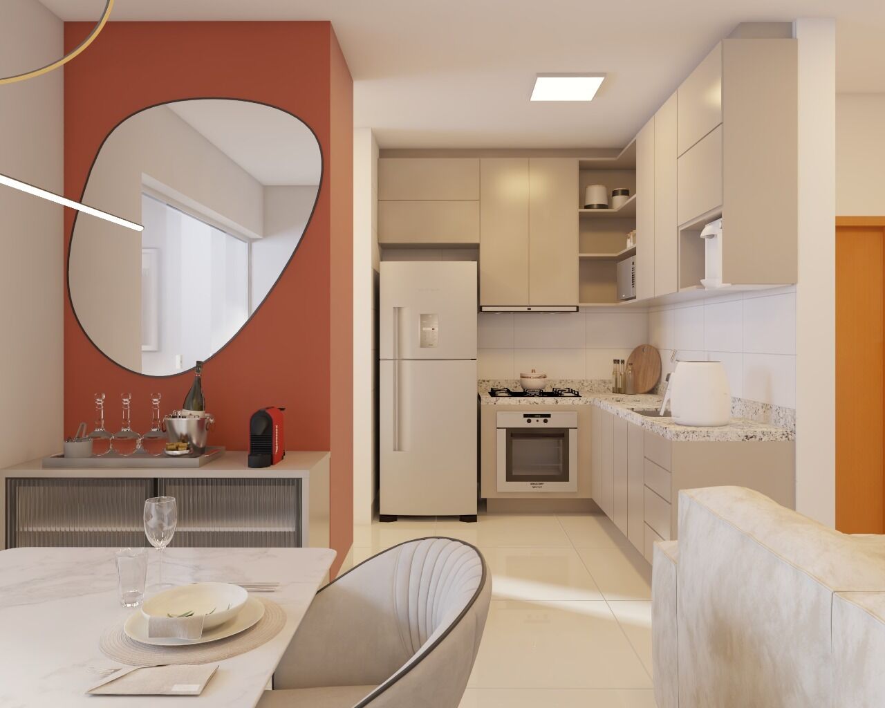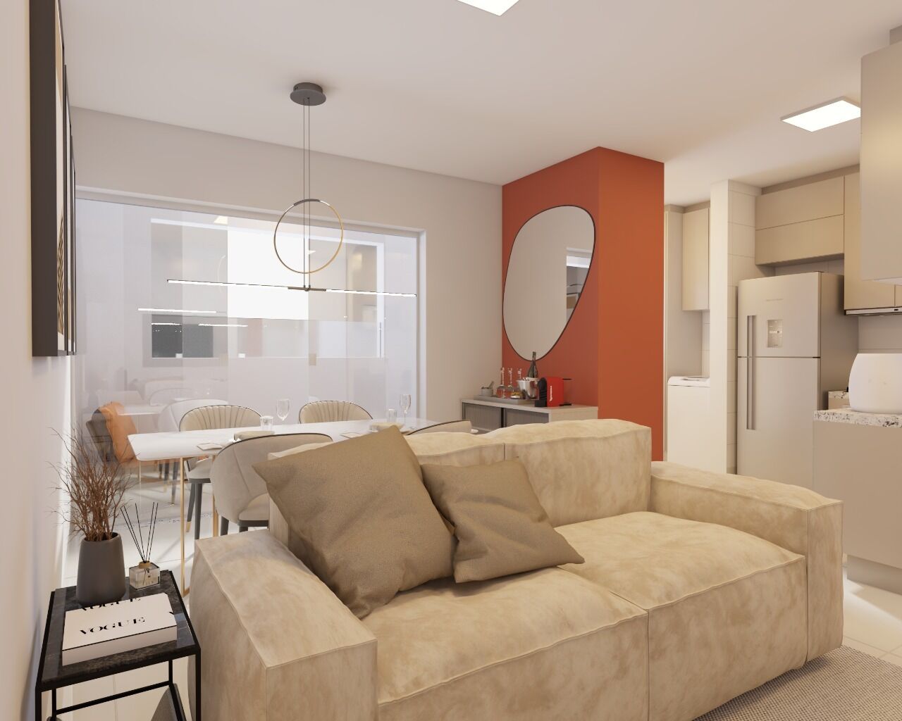 Apartamento com 2 quartos sendo 1 suíte, sacada, cozinha estilo americana, área de serviço separada da cozinha, banheiro social.